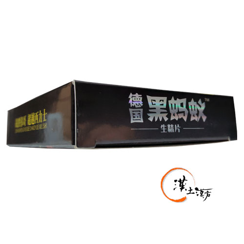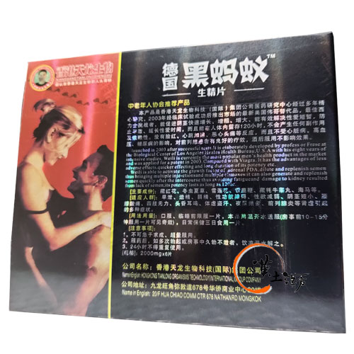 ドイツ黒蟻神は、中国特産の大型黒刺蟻には蛋白質、数種のアミノ酸、ビタミン、酵素物質、亜鉛、マグネシウム、マンガン、セレン、鉄など微量元素、トリノシン、ステリットが豊富に含んであり、これらの総合的栄養物質は有機塩の形で存在しておりますので、人体に吸収しやすく、副作用がありません。擬黒多刺蟻という小さな蟻の体内から丁寧に抽出された希少なエキスを主原料としている極強勃起薬です。特に、年齢を重ねてもいつまでもイキイキと若々しくありたいという人の間で積極的に飲まれている蟻の漢方。