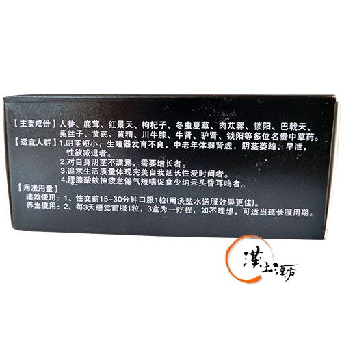 【成分・分量】 高麗人参、鹿茸、紅景天、枸杞子、冬虫夏草、肉蓯蓉、鎖陽、巴戟天、菟絲子、黄耆、黄精、川牛膝など。