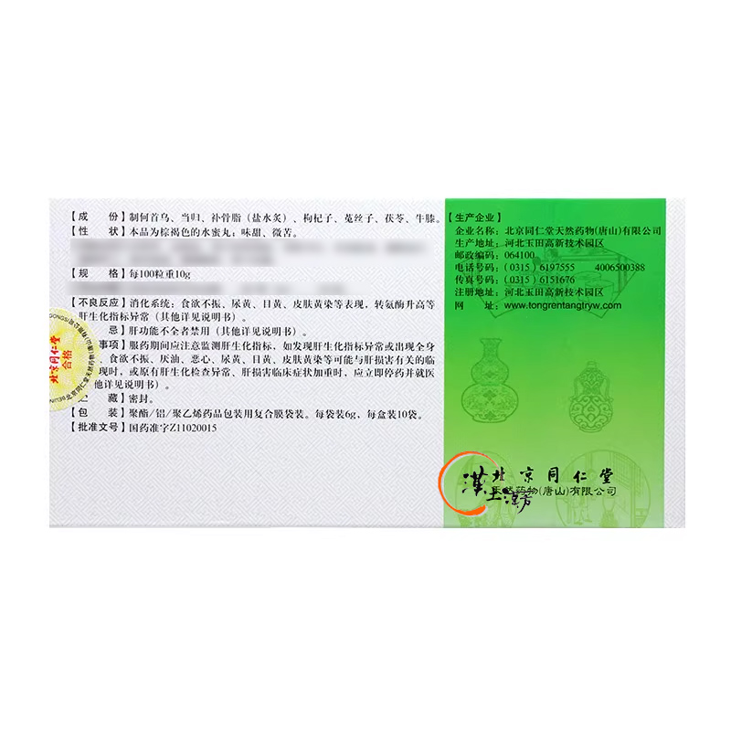 | 効能・効果 | 滋補肝腎(肝と腎を補う)。肝腎両虚による若白髪、歯のぐらつき、寝汗、筋骨の虚弱、腰膝の酸軟(だるさ)、帯下清稀(水っぽいおりもの)の改善。 |