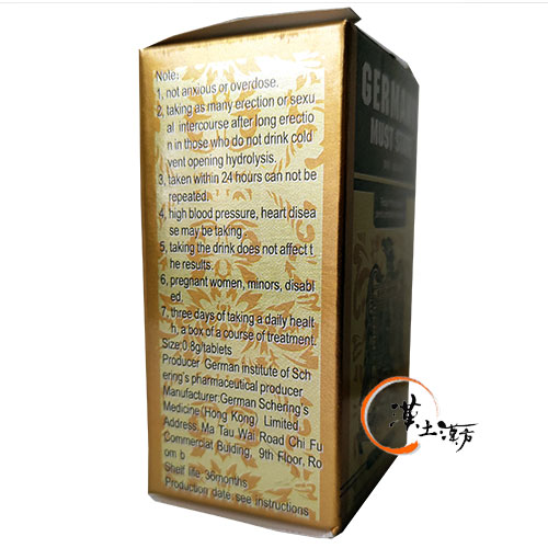 ドイツ必邦補腎生精片は、中国伝統の秘方の精華を抽出し、多種類の天然生薬を組み合わせ、特殊技術を持っている会社の精製技術を駆使して完成させた製品です。開発されてからまだ6年ですが、いま中国国内ではバイアグラをも超える製品となっており、愛用者が激増!