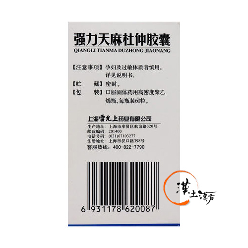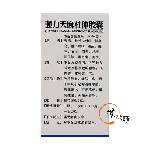 強力天麻杜仲カプセルは、中医学上の“散風活血、舒筋止痛”を目的とした生薬を配合しており、特に主成分の天麻と杜仲は通経絡、補肝腎、活血、強筋骨の作用があり、脳卒中後遺症による半身不随や手足麻痺などを治療するほかに、神経性や体力低下による腰痛、頭痛、関節通などにも対応しています。