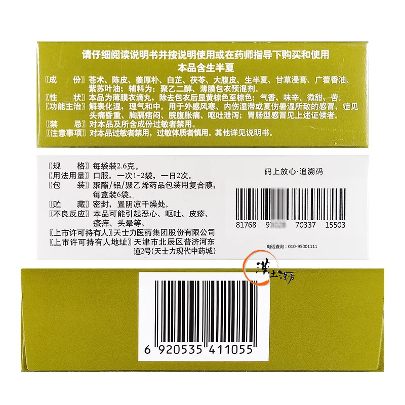 | 効能・効果 (伝統医学) | 解表化湿、理気和中。外感風寒、内傷湿滞による頭痛、ふらつき、胸苦しさ、腹痛、吐き気、下痢などの症状(胃腸型感冒)に用いる。 |
