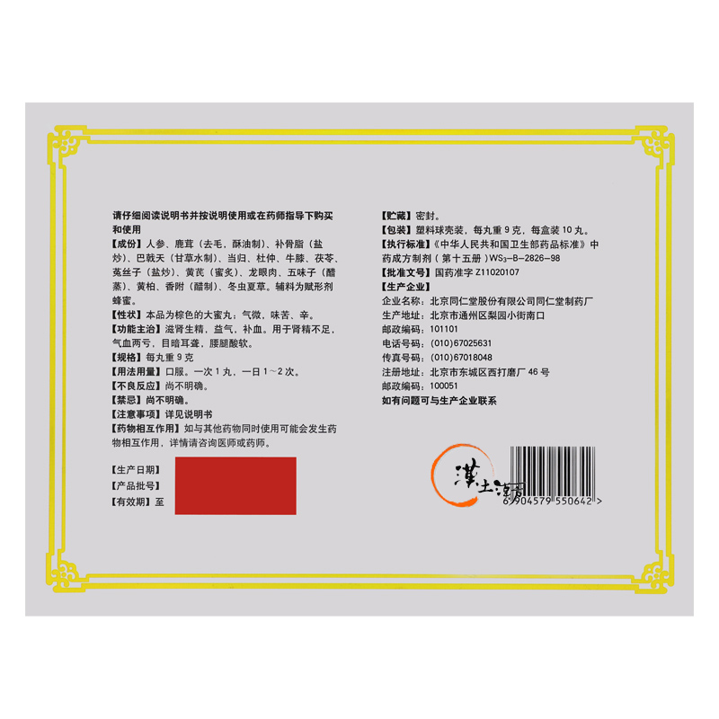 - 人参、鹿茸、補骨脂、巴戟天、当帰、杜仲、菟糸子、炙黄芪、牛膝、黄柏、茯苓、竜眼肉、五味子、香附、冬虫夏草。